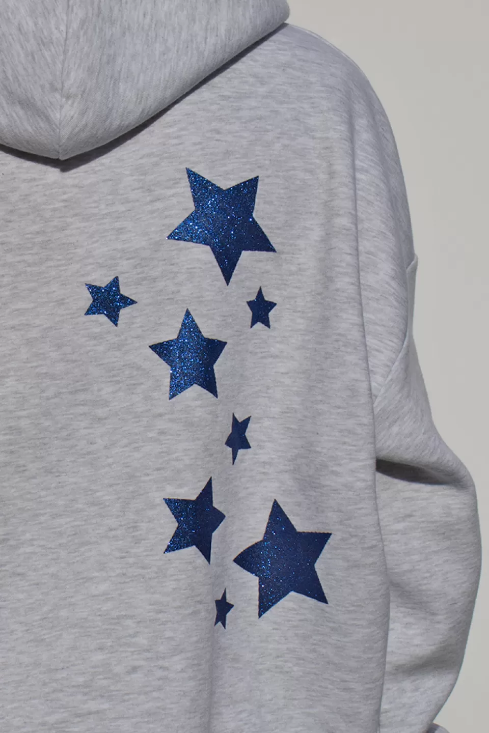 Felpa con stampa stelle glitter, con cappuccio, tasche frontali, maniche lunghe, lunghezza lunga, vestibilità comoda. Spedizione Express e Reso Facile
