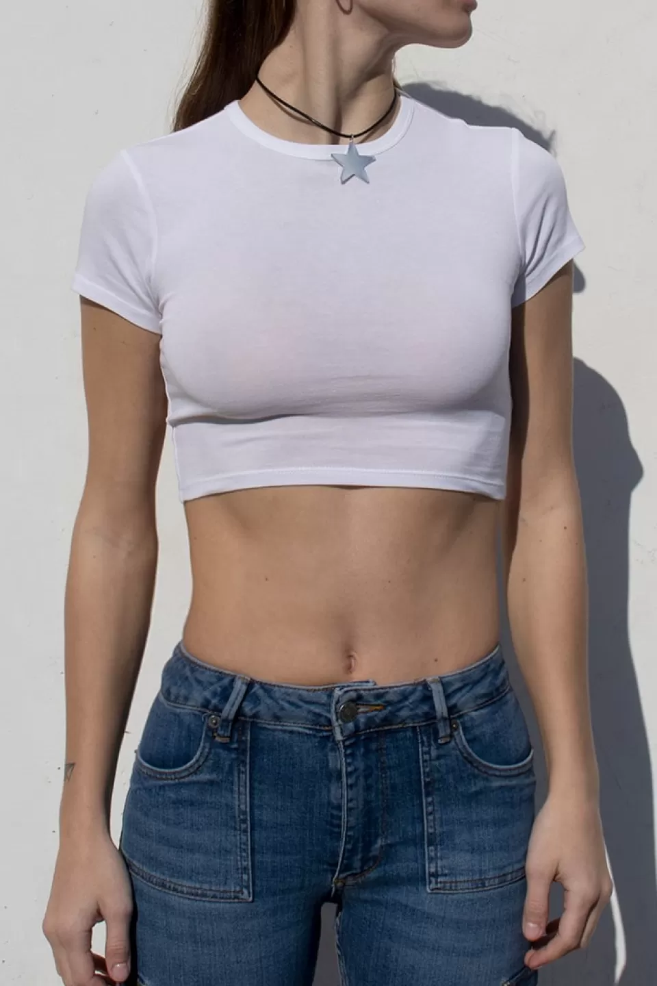 T-shirt girocollo, maniche corte, lunghezza crop, vestibilità aderente. Spedizione Express e Reso Facile